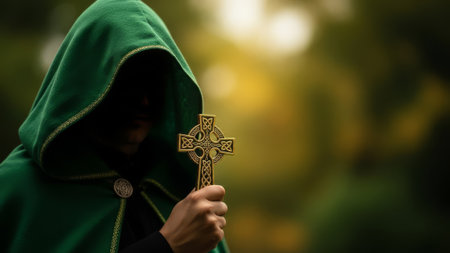 A serene hand holds a cross in a tranquil forest, illuminated by soft sunlight filtering through mist, creating a peaceful and spiritual atmosphere.