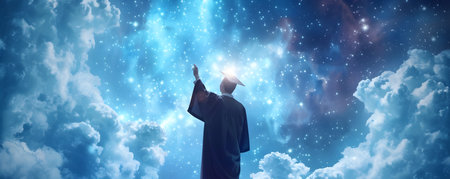The image depicts a lone graduate dressed in a cap and gown reaching out towards a glowing diploma amidst a breathtaking celestial cloudscape The graduate is silhouetted against a stunning backdrop
