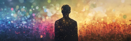 A man's silhouette stands amid a field bursting with colorful lights resembling stars and flowers. The enchanting scene captures a moment of reflection and wonder at twilight.