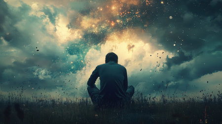 A solitary man sits on a grassy field, gazing at a breathtaking cosmic universe filled with swirling galaxies and clouds. This image evokes feelings of contemplation, exploration, and tranquility.