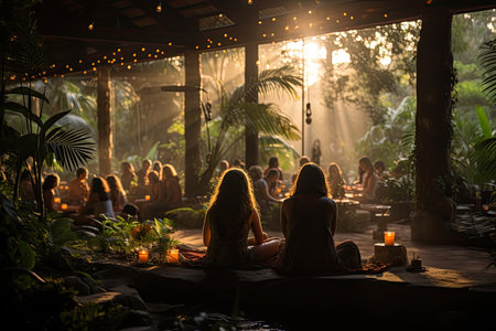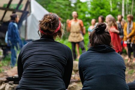 Diverse people enjoy spiritual gathering A close up and rear view of two woman sitting around a campsite, watching spirited shaman guy give speech during enlightenment and mindfulness retreat.