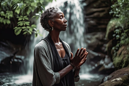 a woman standing in front of a waterfall with her hands clasped and looking up at the sky while she prays. Generative Ai