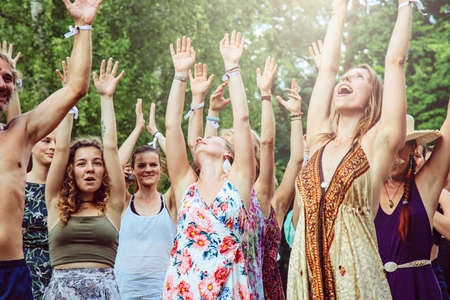 Stage lights and crowd of audience with hands raised at a music festival. Fans enjoying the party vibes.