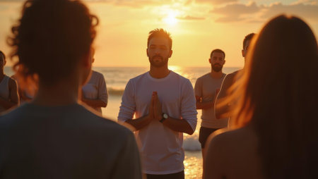 Instructor encouraging group breathing exercise fostering sense of unity , Professional stock photo, AI generated photograph