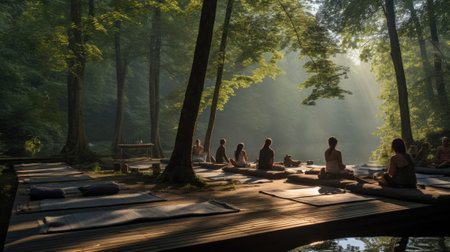 Spiritual retreat by the lake, meditation under the sunset., generative AI