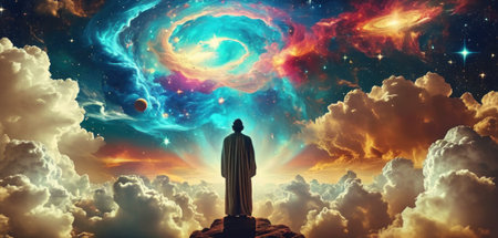 A striking silhouette of a man stands against a vivid cosmic backdrop filled with swirling colors and energetic patterns. The scene evokes a sense of wonder and exploration of the universe.