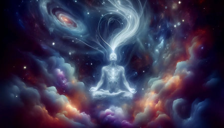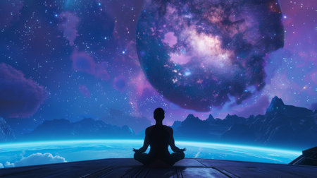 A serene silhouette of a person in lotus position represents meditation and spiritual connection against the backdrop of a cosmic universe.