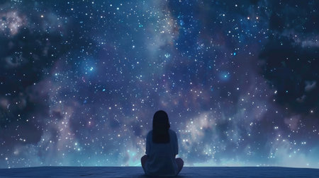 Twilight sky filled with stars, an anime girl sitting peacefully, immersed in the radiant cosmos, creating a tranquil and dreamy scene