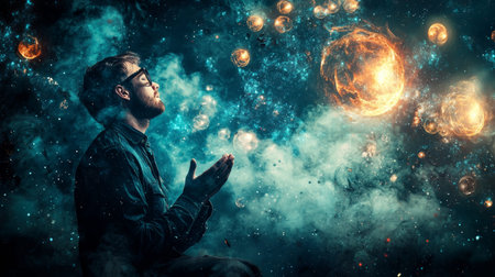 A man in glasses looking up in a cosmic space with glowing orbs and swirling nebula clouds, symbolizing imagination, exploration, and cosmic energy.