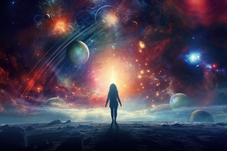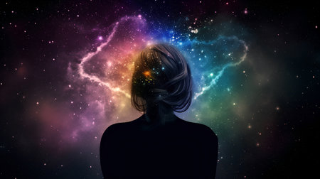 Woman silhouette standing in front of vibrant and colorful abstract space or cosmos background.