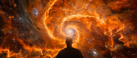 Galactic Orange Nebula, A story of birth and rebirth, swirling in cosmic wonders of the universe Photography, Silhouette Lighting, Double Exposure, Over-the-shoulder shot