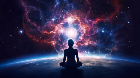 Silhouette of a woman meditating in the lotus position in front of a bright nebula with several planets floating in deep space, creating a cosmic and spiritual atmosphere