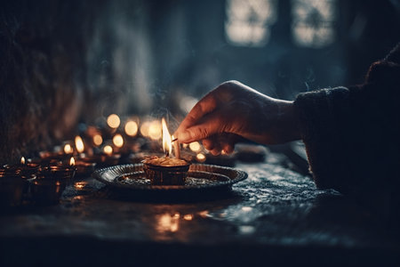 Hand illuminating a traditional oil lamp, casting a warm glow and symbolizing hope, prayer, and faith during a spiritual ritual or traditional ceremony in a dark, atmospheric setting
