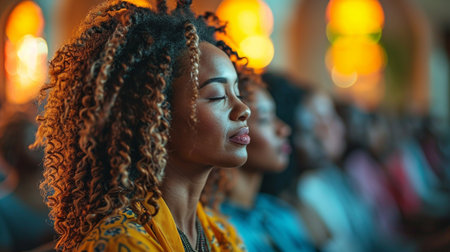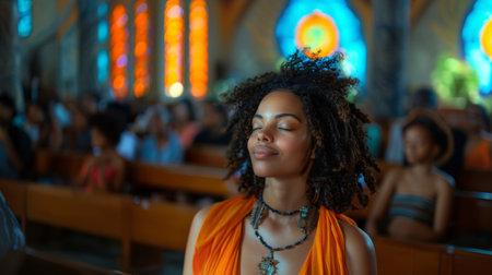 Spiritual African American woman praying peacefully with devotion in a serene church setting, surrounded by stained glass light.