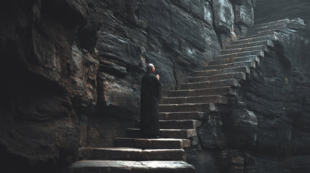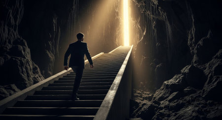 Conceptual Dramatic Businessman Climbing Stairway to Heaven Metaphor Illustration.
