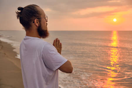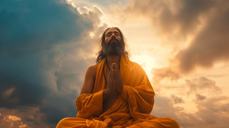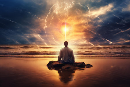 Introspective Transcendental meditation care. Sunset travel spiritual. Generate Ai