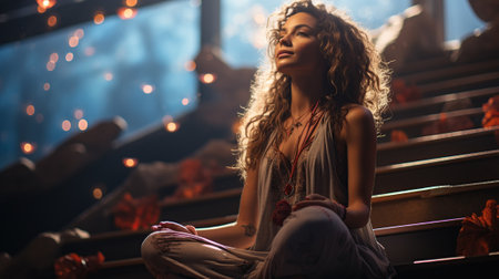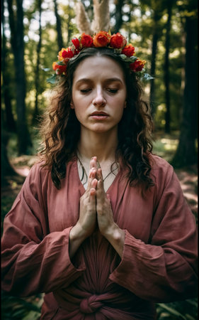 Female figure with curly hair is meditating in tranquil forest, surrounded by vibrant foliage, creating a calming atmosphere of peace and connection with nature