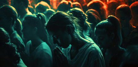 Unity in Prayer, Faith Beyond Destruction. Crowd of people praying.