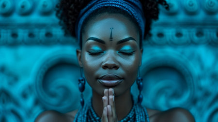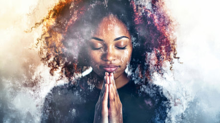 An African American woman engages in prayer, reflecting peace and introspection with a unique watercolor and double exposure effect.