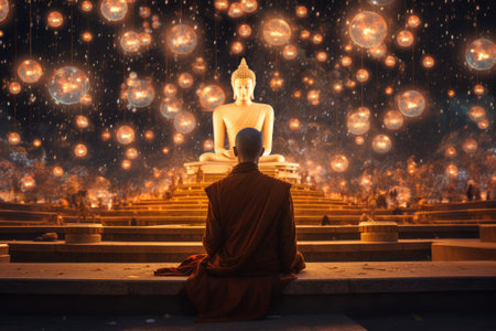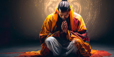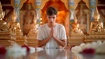 A young man with white complexion of Thai-Indian heritage is meditating and paying respects to the Buddha statue at the temple. GENERATE AI