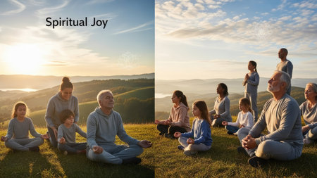 This image depicts multiple individuals engaged in meditation on a grassy area, set against a backdrop of rolling hills and a clear, sunlit sky. The composition features a variety of people in casual attire. The visual elements suggest a sense of tranquility and well-being suitable for various commercial applications.