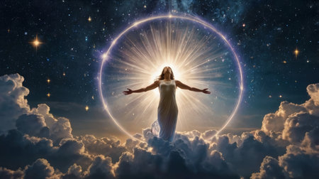 A woman stands amidst fluffy clouds, arms outstretched within a luminous circle of light. Surrounded by a starry cosmos, this image exudes a sense of peace, spiritual awakening, and boundless potential.