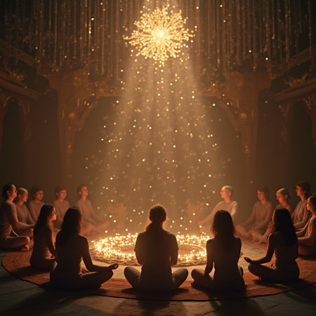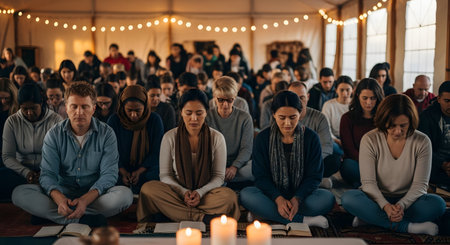A diverse group of people are sitting cross-legged on the floor, meditating with their eyes closed in a calm, warmly lit room. String lights hang in the background, and candles and books are visible in the foreground, suggesting a spiritual retreat, prayer meeting, or mindfulness class.