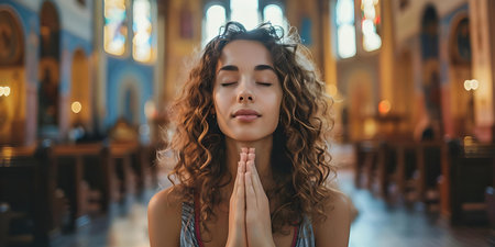 A Woman in Deep Prayer with Closed Eyes in a Church Setting. Concept Religious Portraiture, Deep Prayer, Church Setting, Spiritual Reflection, Closed Eyes