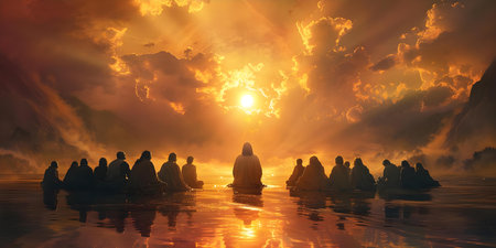 Jesus Christ stands before a crowd of believers, his arms raised in blessing, as the sun sets behind him, illuminating the sky with golden light.