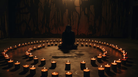 Young man with curly hair meditating in a mystical atmosphere surrounded by candles and starry background, conveying peace and introspection in a dark setting