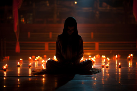 Woman meditating in a peaceful room, kneeling by candlelight, hands clasped in prayer, serene atmosphere emphasizing mindfulness.