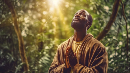 African guy offering thanksgiving while surrounded by greenery. GENERATE AI