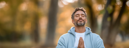 A man with a serene expression is meditating outdoors in a beautiful autumn setting