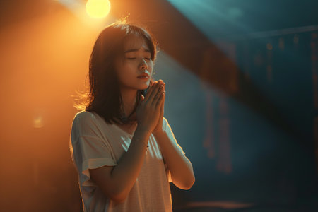 Concept photo of a person standing in the moonlit garden, their eyes closed and palms pressed together in prayer, as if communing with the divine