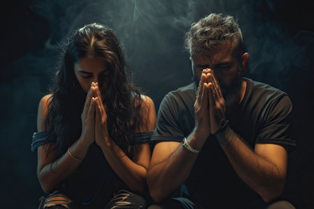 Latin American man and woman pray to god together on dark studio background. Cinematic effect
