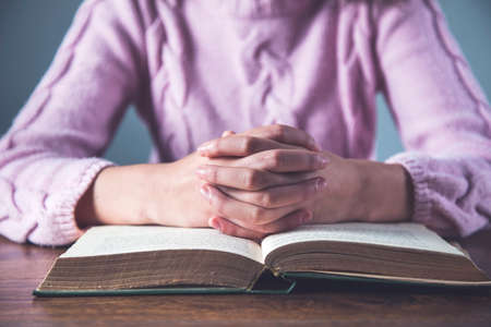 Close-up women christian read bible. Hands folded in prayer on a Holy Bible on wooden table.