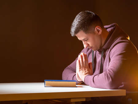Man prays at the table. Person is sitting at a table with a Holy Bible. Man turns to God. Religion and faith. The crisis of Christian life. Prayer for God's blessing. Beg for forgiveness.