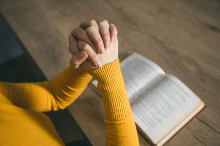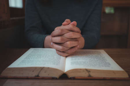 Hands folded in prayer on a Holy Bible in church concept for faith, spirituality and religion, woman praying on holy bible in the morning. woman hand with Bible praying.