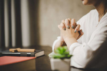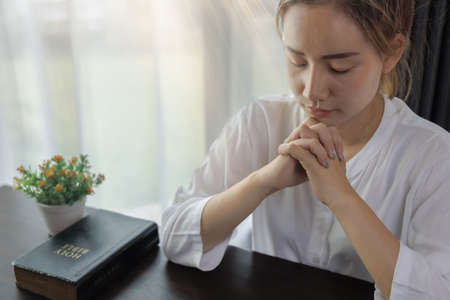 Christian life crisis prayer to god. Woman Pray for god blessing to wishing have a better life. woman hands praying to god with the bible. begging for forgiveness and believe in goodness.