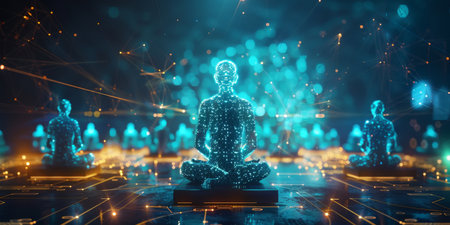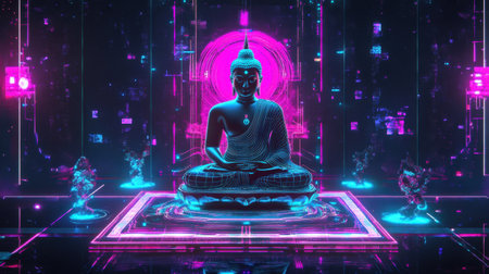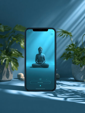 Smartphone shows a meditation app featuring a tranquil Buddha statue, illuminated by soft blue light and framed by lush plants on a calming surface.