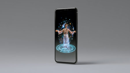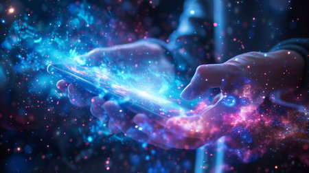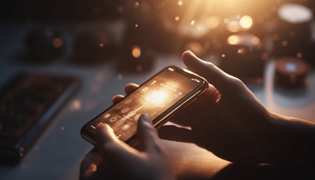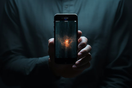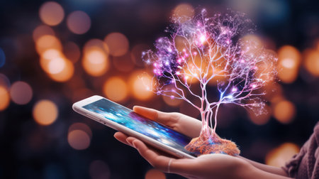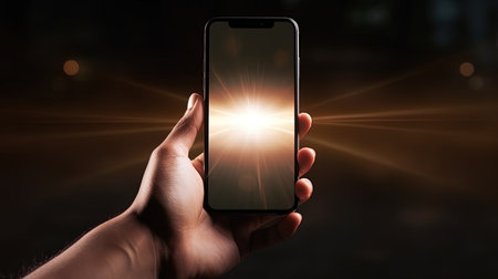 Hand holding illuminated smart phone, close up of touch screen technology generated by artificial intelligence
