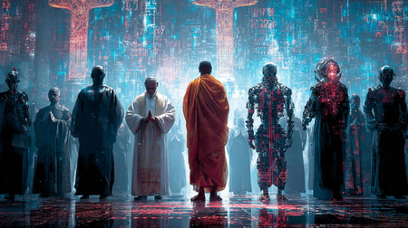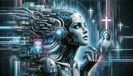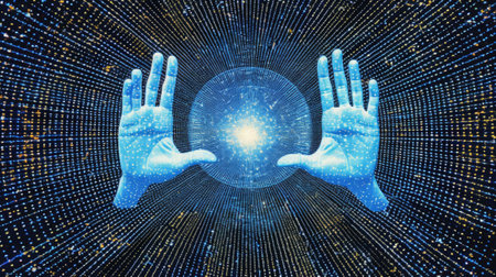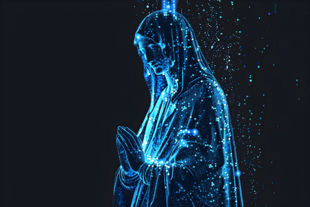 A vibrant, glowing electric hand emerges from a Holy Bible. This artwork symbolizes the blend of spirituality and technology, showcasing a modern interpretation of faith.