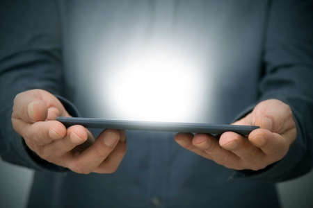 Double exposure of man's hands holding and using a digital device and tech theme hologram drawing. Technology concept.