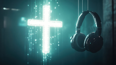 A glowing white cross hanging in mid-air, with large headphones suspended beside it, radiating energy.