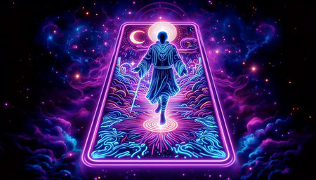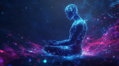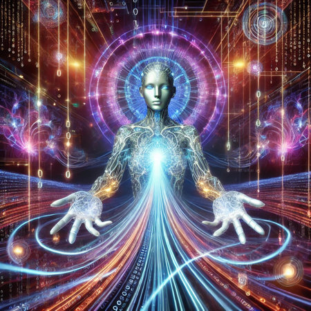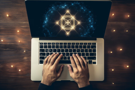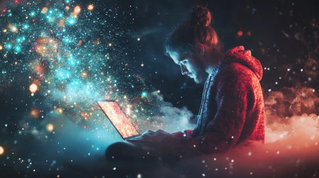 A man focused on his laptop surrounded by ethereal, glowing cosmic energy, symbolizing creativity, technology, and a connection to the universe.