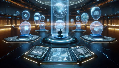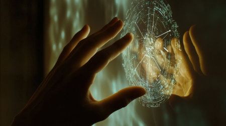 A focused shot of a users hands midaction manipulating a translucent holographic interface that displays secure transaction pathways. The surrounding ambiance is dim with the hologra
