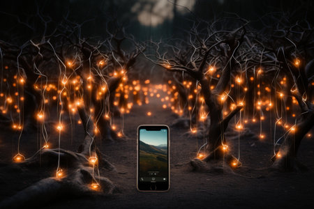 Smartphone with social media icons sprouting into digital forest, seamless connectivity concept