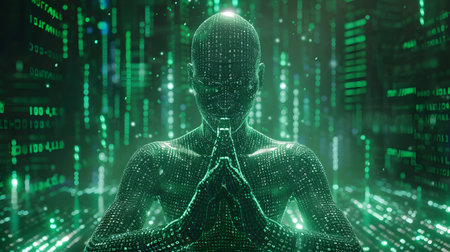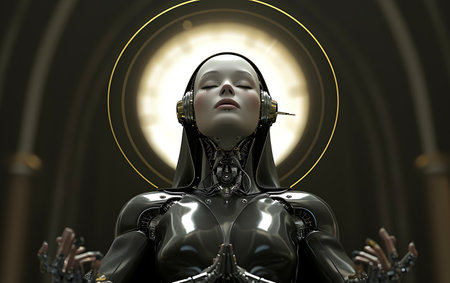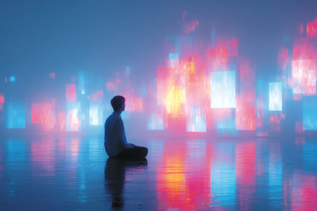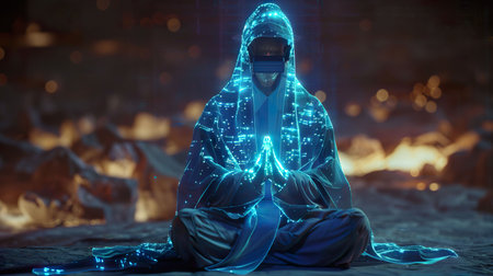 An ethereal figure enveloped in a glowing robe stands amid radiant lotus flowers, creating a serene and dreamlike atmosphere perfect for fantasy art or spiritual themes.