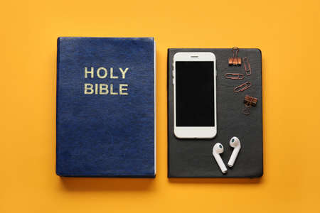 Bible with phone and headphones,Concept listen the words of God.Bible, phone and earphones on wood table.