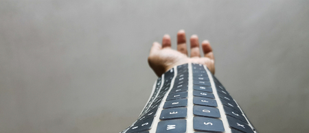 close up of hand using mobile payments online shopping,omni channel,in modern office wooden desk,icons graphic interface screen,eyeglass,filter,black white